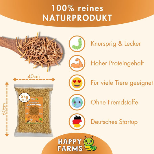 Unsere getrockneten Soldatenfliegenlarven sind einzigartig in ihrer Beschaffenheit und Anwendungsvielfalt. Sorgfältig gezüchtet und schonend getrocknet, bewahren sie ihren hohen Nährwert und leckeren Geschmack. Als natürliche und proteinreiche Nahrungsquelle sind sie ideal für Vögel, Reptilien und andere Haustiere geeignet. Die außergewöhnliche Beliebtheit bei Tieren macht sie zu einem unwiderstehlichen Genuss. Durch die Integration unserer Mehlwürmer in die Ernährung fördern Sie die Gesundheit und Lebendigkeit Ihrer tierischen Begleiter.